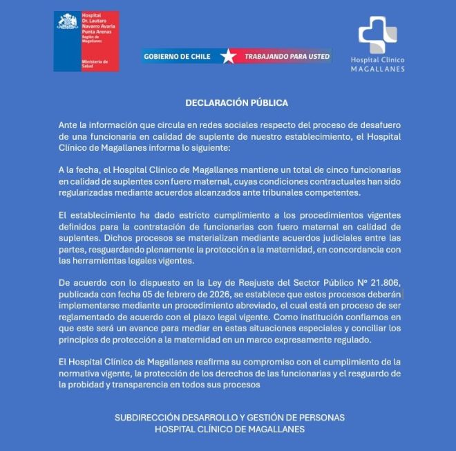 A la fecha, el Hospital Clínico de Magallanes mantiene un total de cinco funcionarias en calidad de suplentes con fuero maternal, cuyas condiciones contractuales han sido regularizadas mediante acuerdos alcanzados ante tribunales competentes.